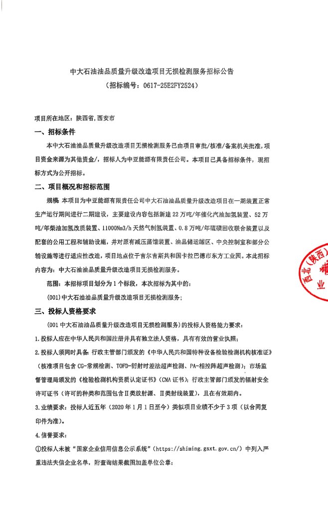 保标招标 > 无损检测 > 招标信息 > 中大石油油品质量升级改造项目无损检测服务招标公告